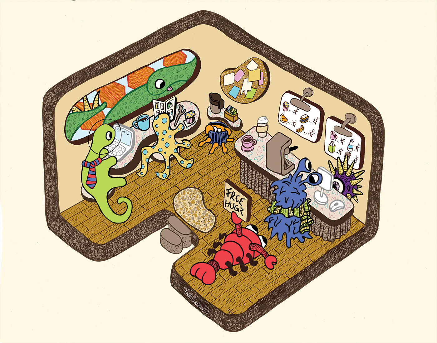 Created for as an exercise in creating isometric interiors for a drawing class. (ink and digital color, 14" x 11", 2024).