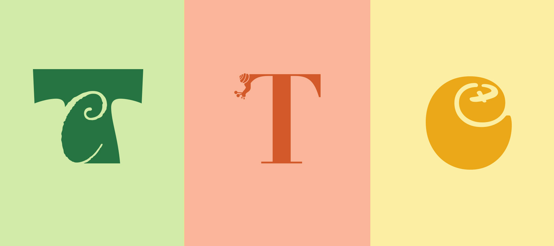 These monograms were designed as part of a personal logo project. While I wound up going a different direction with that project, these three monogram logos were all strong and could be used in other applications. Two of the three combine my initials “t” and “c”. The first combines two very disparate typefaces. I started with the “c” in Bely Black. I liked the circular (rather than more open) construction of the letter. When I was looking for the complimenting “t”, I knew I wanted to tie the tail of the “t” with the open portion of the “c”. This meant searching for a very specific thickness and angle ( and even then I had to do some adjusting). The second combines a display typeface with a script one. The challenge here wasn’t in selecting the complimenting typefaces, but rather in finding a way to overlap them where both letters were visible and not creating any unpleasant tangents. The last monogram is leans into the humorous category and combines a very traditional serif typeface with a glyph (that came from one of the other typefaces displayed here). I needed a flat surface for the snail to crawl up and the serifs were perfect for that. I also enjoyed the dissonance of the traditional typeface with the more humorous snail. (2023)