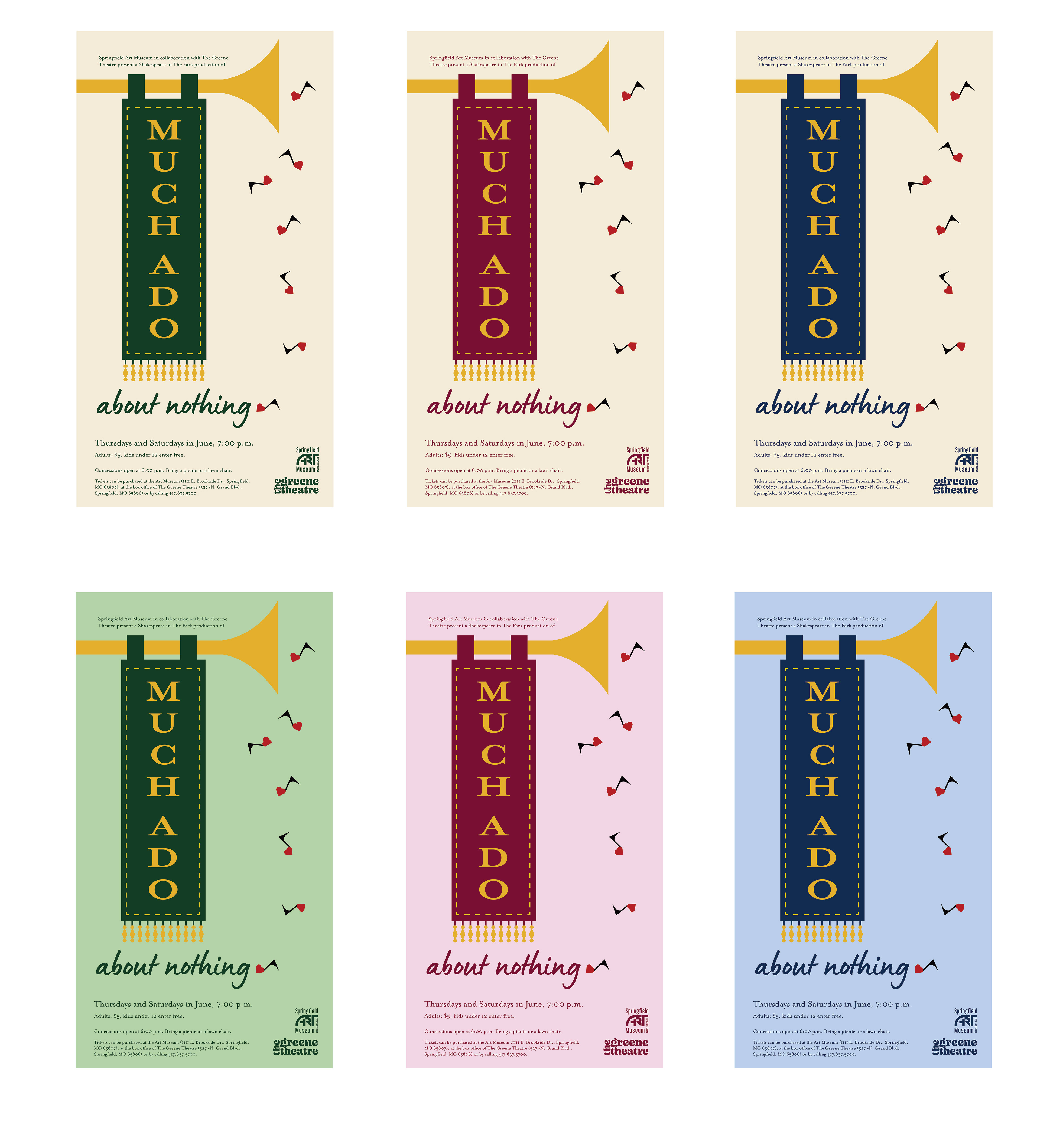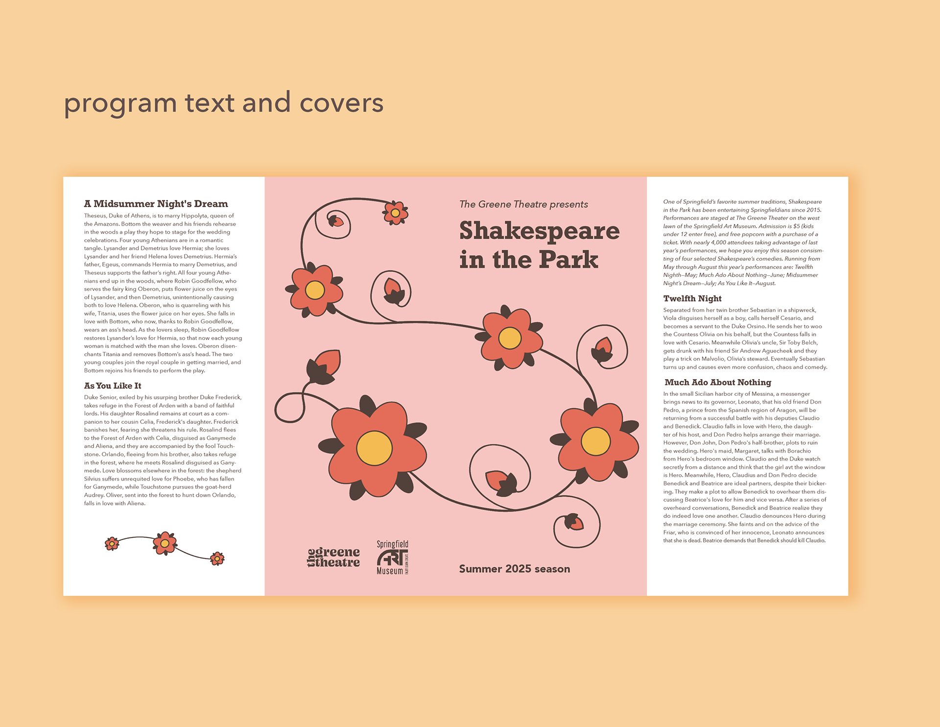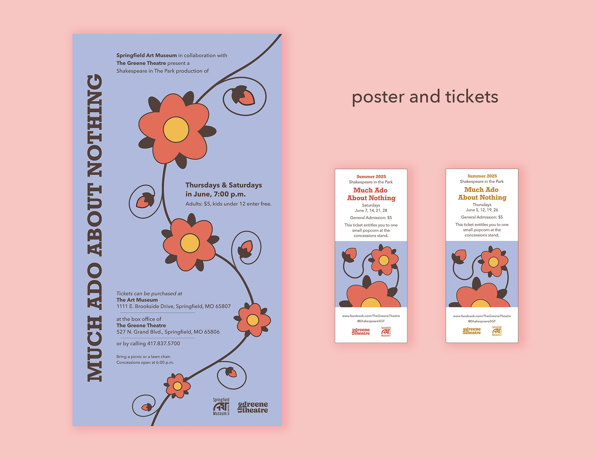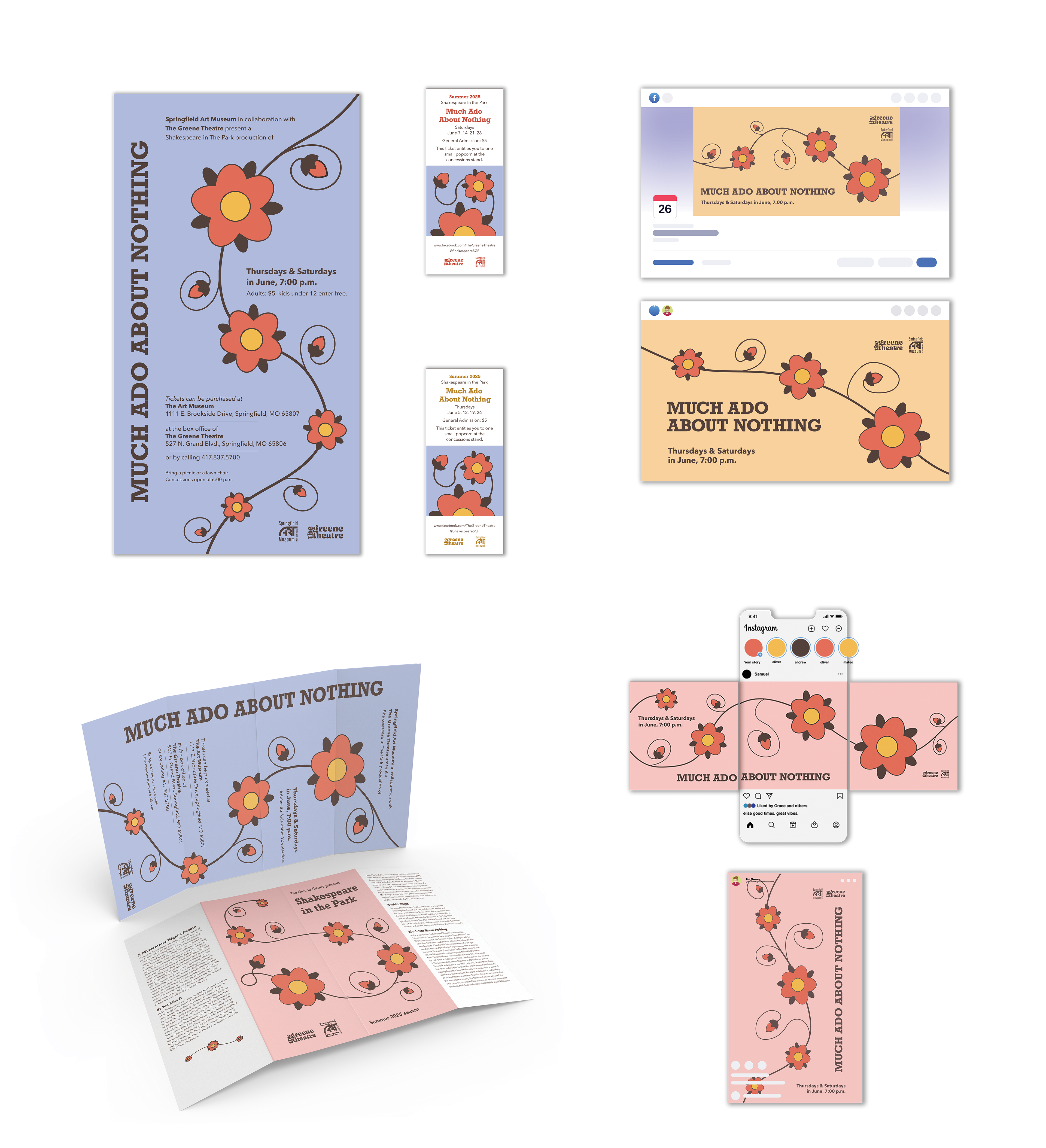 For this project, I was asked to create a series of assets for a Shakespeare in the Park event series. In the upper left corner are a promotional poster and tickets (one for Thursday performances and one for Saturday performances. In the bottom left is a program featuring the poster in the center as a souveneir. Along the left side are social media assets including a Facebook event cover and ad and an Instagram carousel and story. (2024)