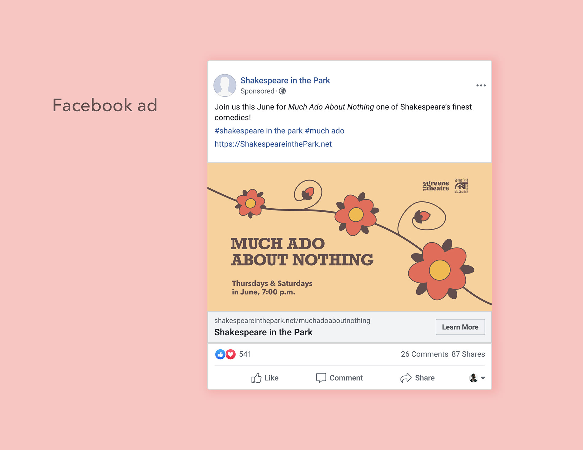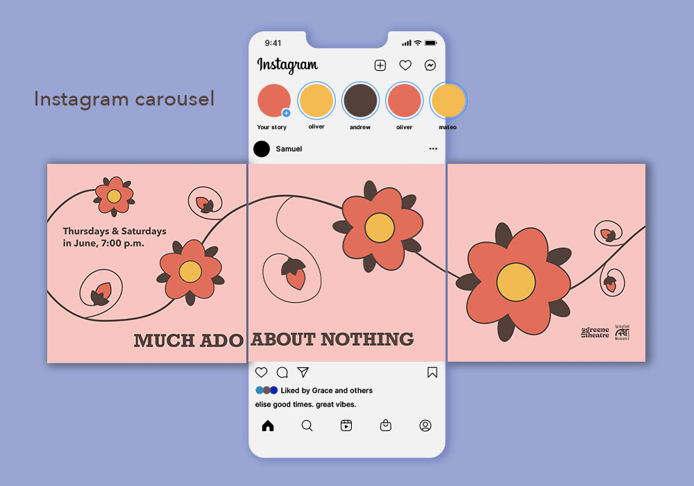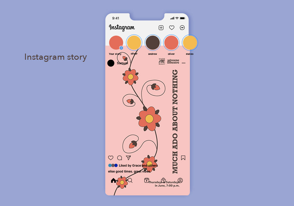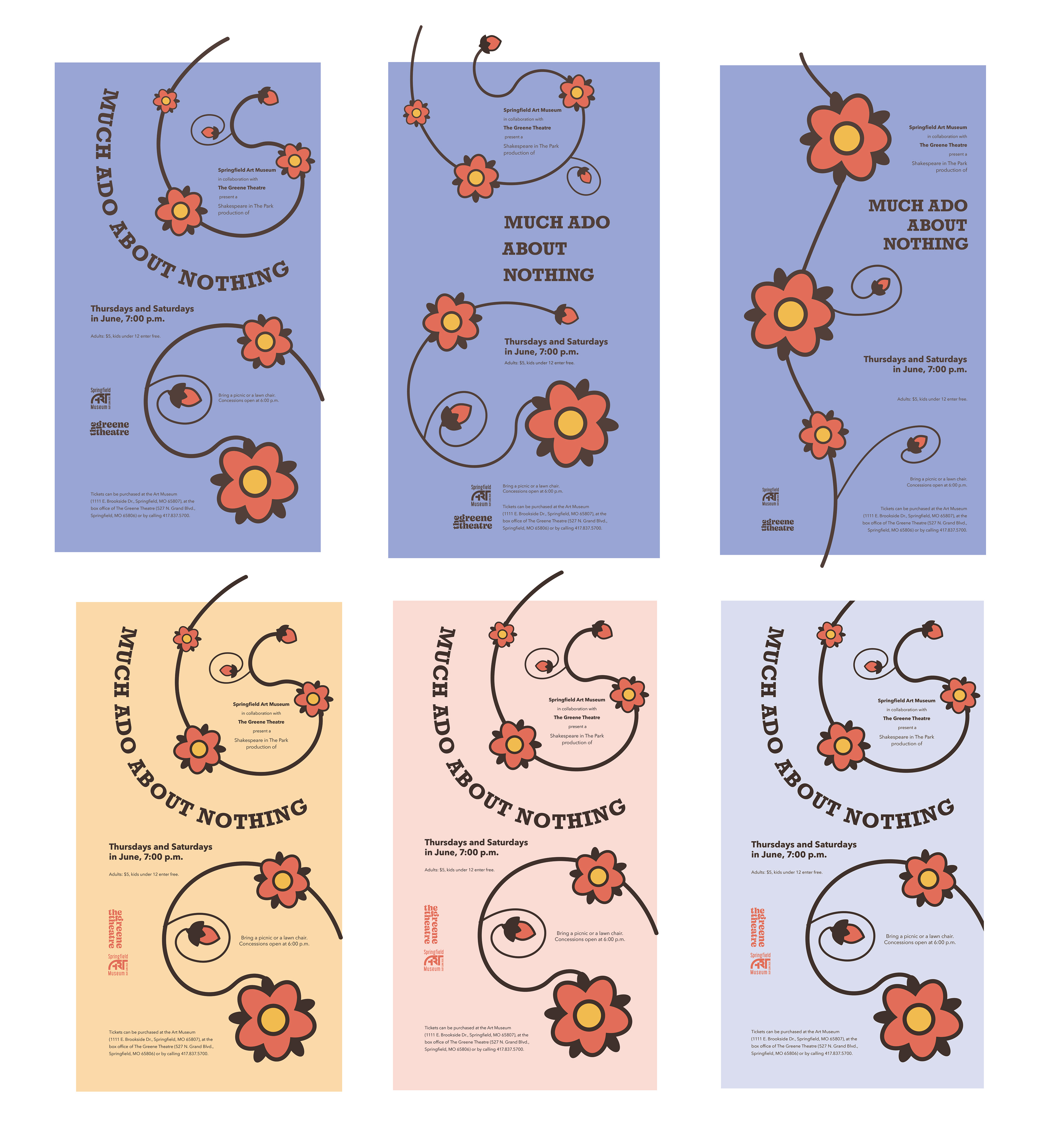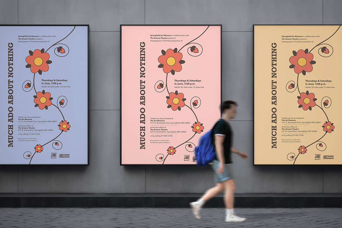 For this project, I was asked to create a series of assets for a Shakespeare in the Park event series. In the upper left corner are a promotional poster and tickets (one for Thursday performances and one for Saturday performances. In the bottom left is a program featuring the poster in the center as a souveneir. Along the left side are social media assets including a Facebook event cover and ad and an Instagram carousel and story. (2024)