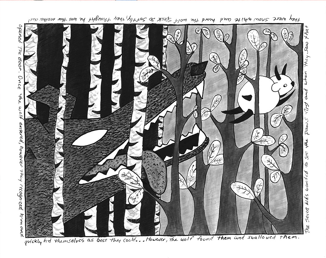 An illustration from the fairy tale "The Wolf and the Seven Kids". Created for class. (ink dip pen and ink wash, 11" x 14", 2023).
